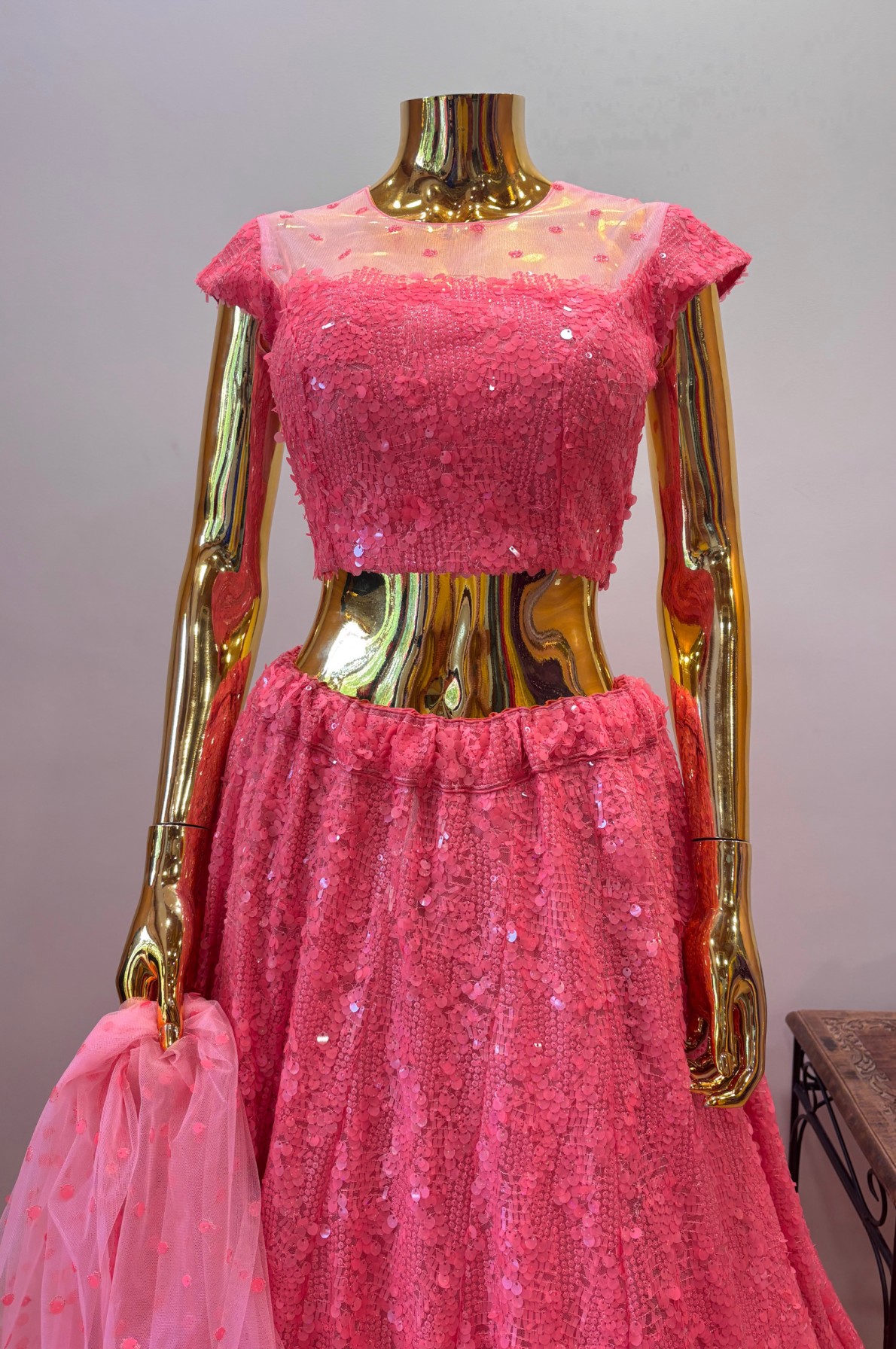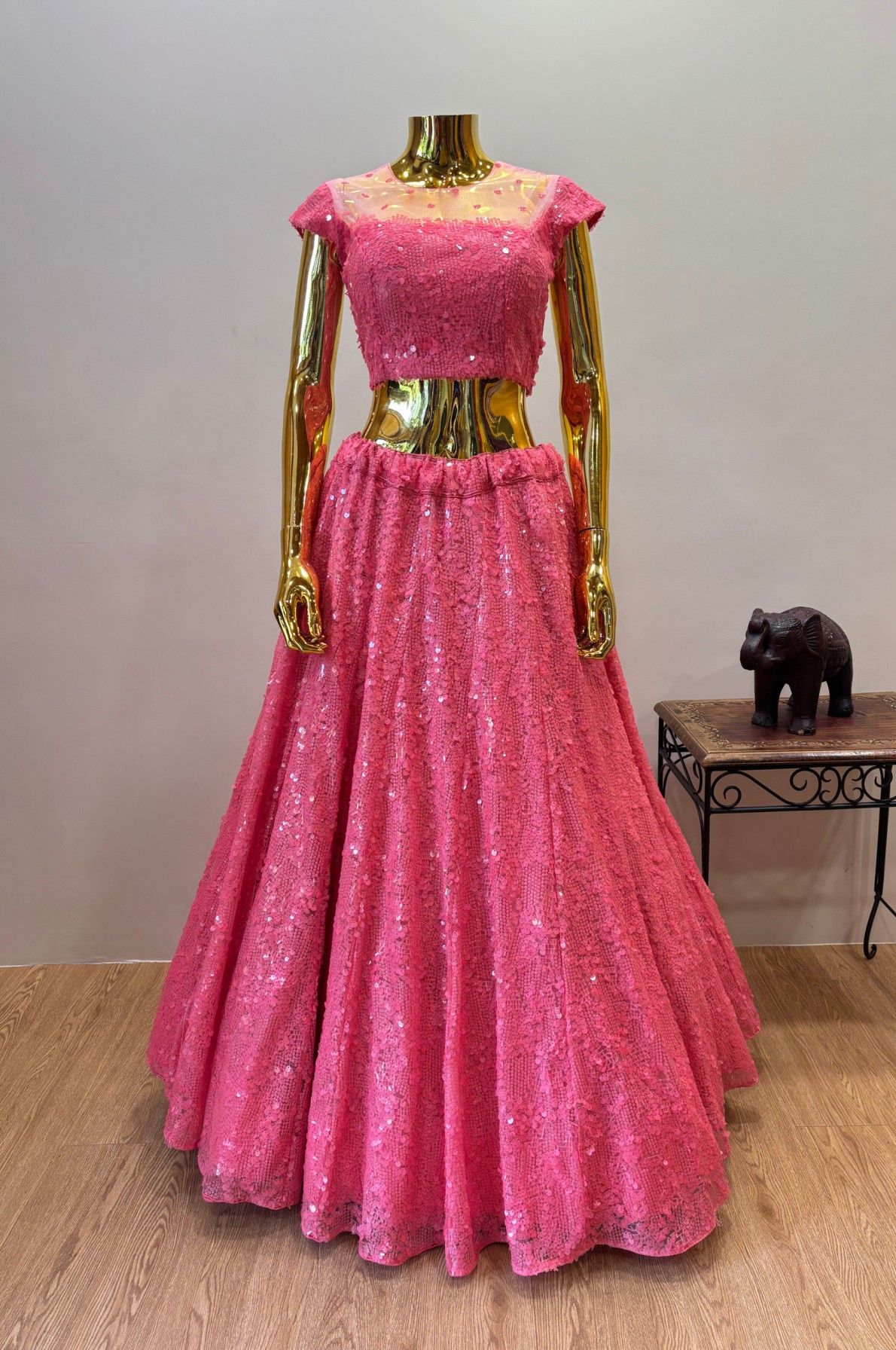 This fully sequin full-flared lehenga exudes elegance with its shimmering embellishments and graceful movement. Paired with a cap-sleeve blouse, it offers a balanced blend of modern charm and style. The scallop border net dupatta adds a delicate, ethereal touch, perfect for weddings or festive occasions. Its soft hue and sparkling details create a dreamy, feminine ensemble.