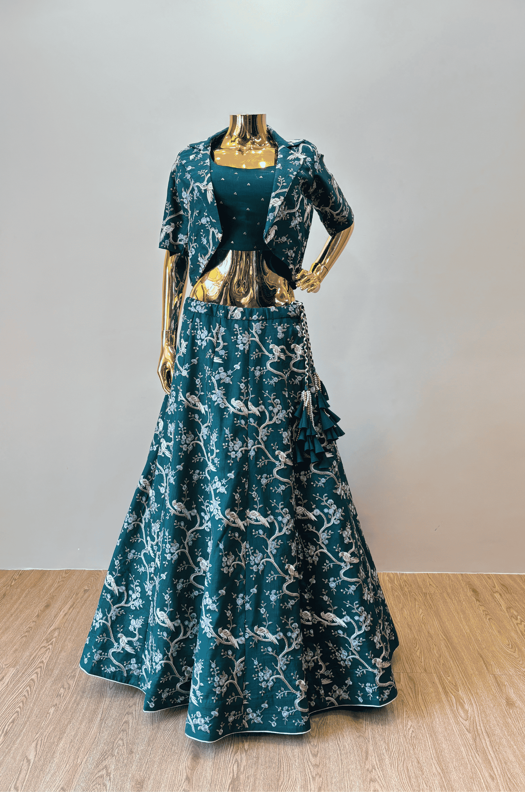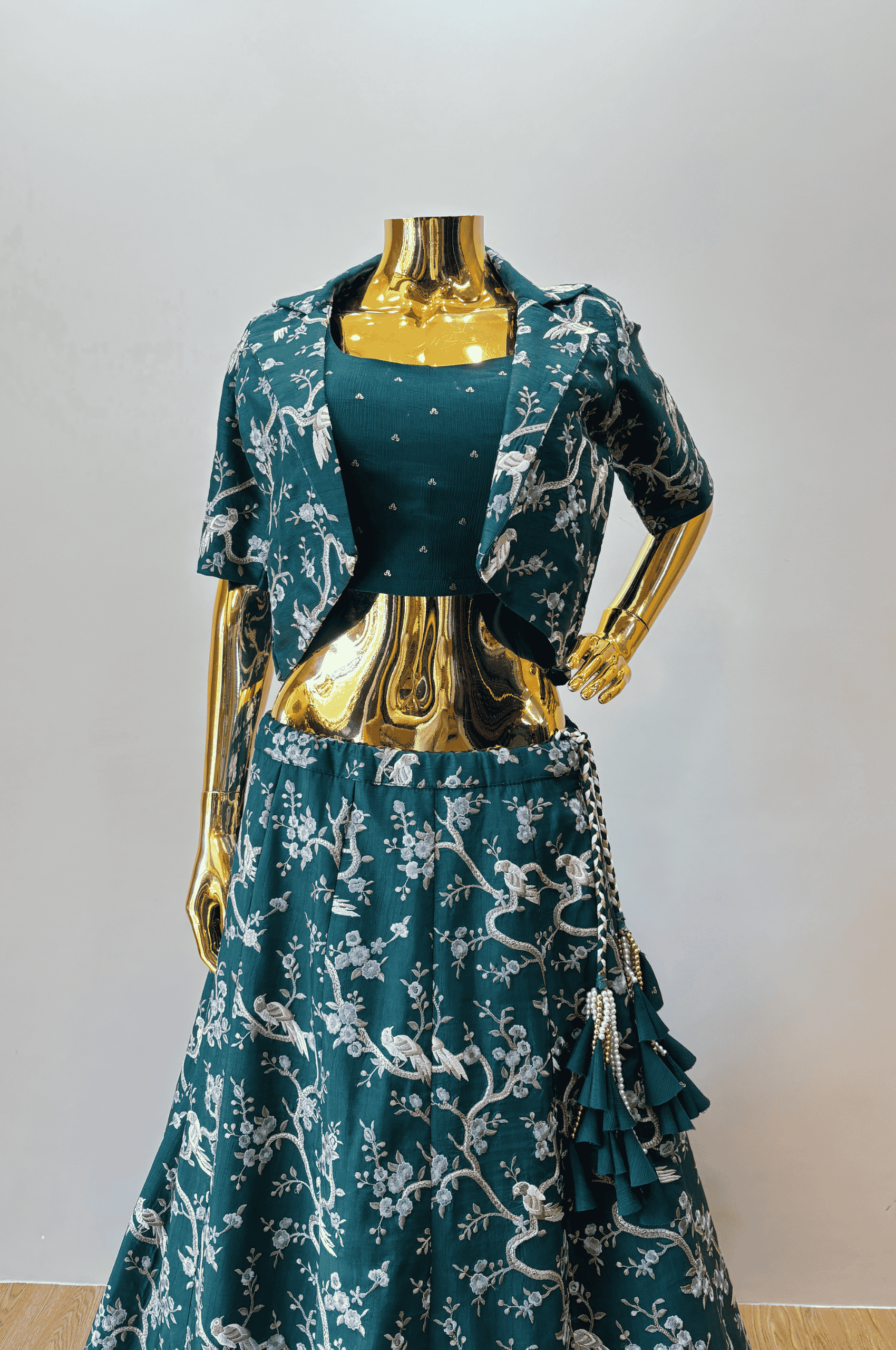 This green lehenga features intricate jaal embroidery that adds a rich, traditional charm to the ensemble. Paired with a matching blouse and a contemporary blazer-style jacket, it effortlessly blends ethnic elegance with modern sophistication.