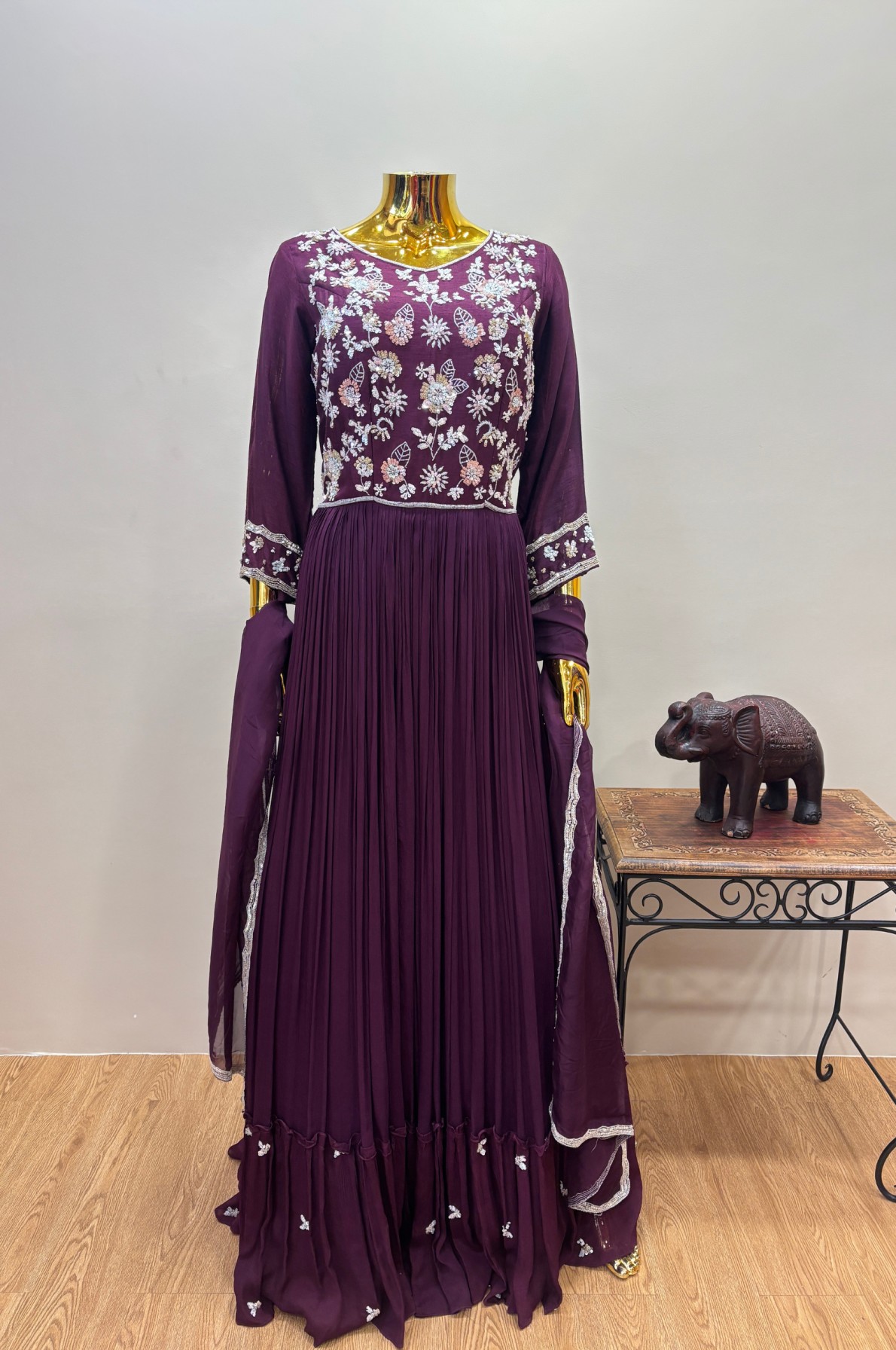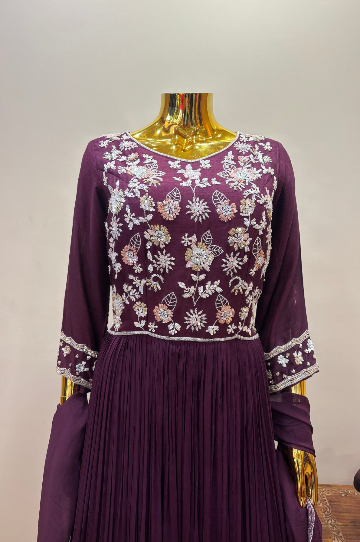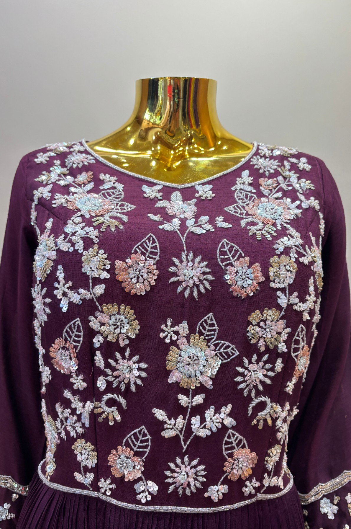 Embrace timeless charm in this stunning wine gown, highlighted by pastel sequin floral motifs on the yoke and sleeve hems. The intricate detailing along the flare hem adds a touch of grace and sophistication. Crafted with elegance in every stitch, the gown flows beautifully with every movement. Paired with a delicate scallop-edged dupatta, it creates a look that’s both ethereal and regal—perfect for special celebrations.